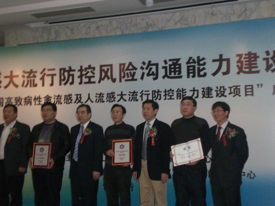 会上,卫生部资金监管中心主任于德志、中国健康教育中心(卫生部新闻宣传中心)主任毛群安、世界银行项目官员王世勇、卫生部应急办主任梁万年、卫生部新闻办主任宋树立等与会领导与嘉宾向安徽省寿县项目试点县颁发了“流感大流行大众风险沟通能力建设首批试点县”铜牌与证书。