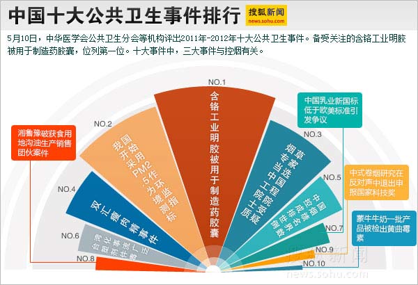 本报讯(记者 方芳)中华医学会公共卫生分会等机构日前评出2011年至2012年十大公共卫生事件,毒胶囊列第一位。与控烟有关的事件占据三项。