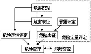 危险分析(Risk Analysis):对机体、系统或人群可能暴露于一种危害的场景的分析与控制过程。危险分析由三部分构成,即危险评定、危险管理和有关危险的信息交流。危险管理(Risk Management)考虑了与危害信息相关的危险评定信息及其有关联的政治因素、社会因素、经济因素和技术因素的决策过程,以发展、分析和比较各种法规和非法规选项,并针对危害选择和实行适当的管理反应。危险交流(Risk Communication)是在评定者、管理者、新闻媒体和一般公众之间关于(健康或环境)危险的信息的相互交换。危险分析的最终目的是预防和控制健康风险,使人类社会逐步达到健康状态。危险评定用于危险管理,危险管理决策是在危险信息的反复交流过程中形成并得以实施。危险评定、危险管理和危险交流三者之间的关系见下图。