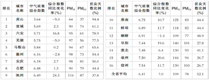 注:(1)空气质量排名采用空气质量综合指数大小来确定,指数越小表明空气质量越好。 (2)空气质量综合指数是指评价时段内,参与评价的各项污染物的单项质量指数之和(单项指标评价时段内平均浓度与该指标二级标准限值的比值,SO2、NO2、PM10及PM2.5采用年均浓度二级标准限值、O3和CO采用日均浓度二级标准限值),指数越大表明城市空气污染程度越重。 (3)空气质量综合指数同比变化率指本年度评价时段内空气质量综合指数与上年同期变化幅度,变化率大于0代表空气质量恶化、小于0代表改善、等于0代表持平。